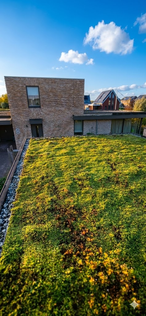Een groendak vermindert de CO2-uitstoot en draagt bij aan de verbetering van de luchtkwaliteit door de opname van koolstofdioxide en de afgifte van zuurstof.